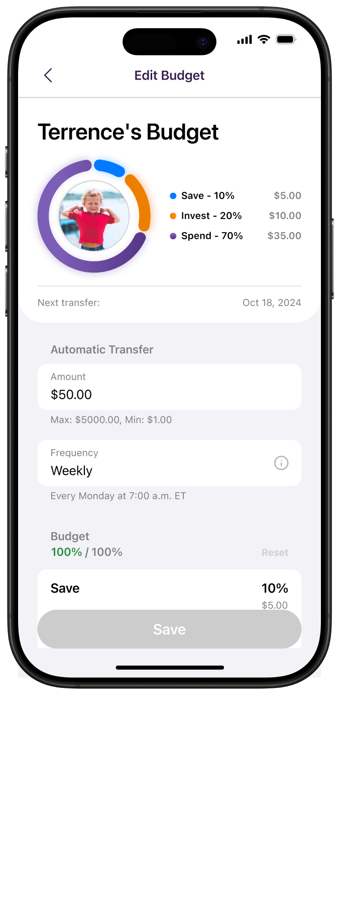 Cinema trips with friends? Saving for a new game? Whatever their spend, just set up automatic transfers to send kids money every week, and divide between savings, investing, and spending.